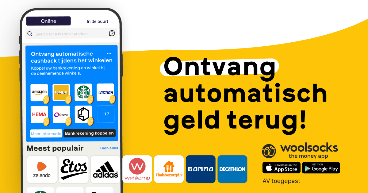 Woolsocks is een gratis financiële app die cashback biedt op aankopen bij duizenden winkels, zowel online als in fysieke winkels. De app biedt ook inzicht in je uitgaven, helpt je abonnementen op te zeggen en biedt mogelijkheden om te investeren in aandelen via zogenaamde 'Stock Points'.